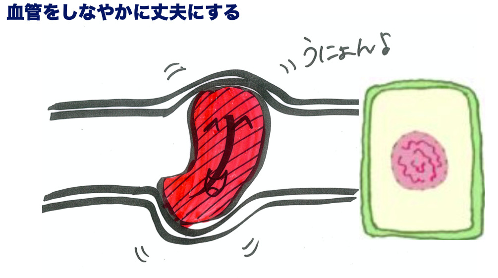 こんな風に細ーい5ミクロンの毛細血管の中を7〜8ミクロンの赤血球は