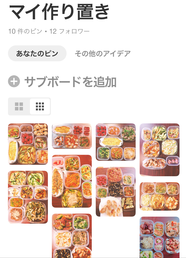 それと、自分のスマホの中にシリーズでストックしているのを整理してピンタレストの自分のページにまとめておいておけること!こんな感じです↓娘のお弁当のおかずを毎週作り置きで作っていて、それを取っておきたかったんです。頑張ったね自分って感じでニヤニヤするためにw