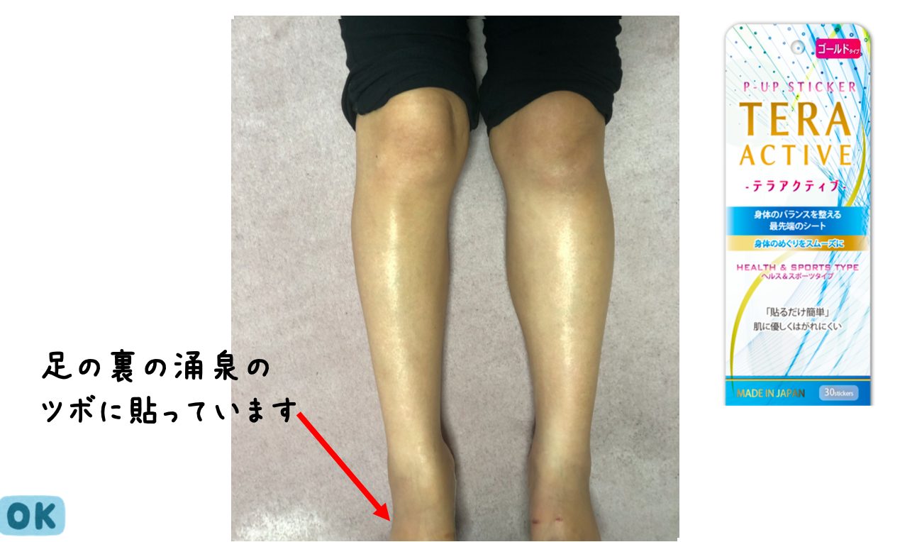 この写真は脚のむくみがひどい時にP-UP加工されたテラアクティブステッカーを足の裏に貼った15秒後!